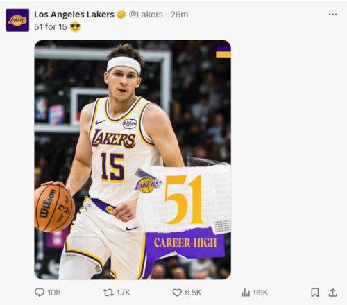赛后奥斯汀-里夫斯拿到51+准三双直接登上了全美第二热搜,这场比赛湖人的赢球全靠他,除了詹姆斯、东契奇、海斯、克勒贝尔、蒂耶罗无法登场外,第三节文森特也崴脚,里皇真的独扛一队。