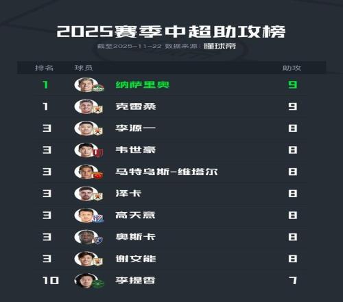 北京时间11月22日,中超联赛第30轮比赛全部结束,最终纳萨里奥、克雷桑以9次助攻并列本赛季助攻王。本赛季中超联赛助攻榜如下。