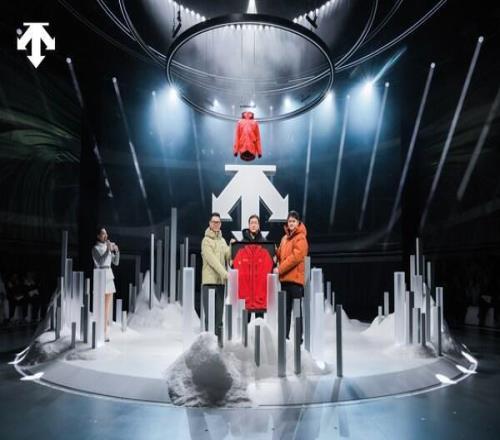 大秀走秀环节接续上演,以科技为翼勾勒全景运动图景,四大核心装备系列依次亮相。从彰显专业巅峰的国家队系列、贴合滑雪运动核心需求并融入匠心的单双板场上和场下装备,到融合非遗文化的香云纱系列、凝练匠心与机能美学的 ALLTERRAIN 系列,再到与艺术家Daniel Arsham联手打造的联名系列,全面覆盖专业运动与都市生活多元场景。期间,迪桑特签约运动员周苡竹领衔一众儿童模特身着儿童滑雪系列惊喜登场,萌趣中尽显冰雪运动的新生代活力。他们牵引迪桑特品牌代言人步入秀道,将"未来力量"与"专业领航者"在同一时刻连接,共同完成大秀高潮的递进。当三位代言人来到舞台中央,全场灯光随之开启最终章节的点亮,30套走秀造型悉数回归,构成整场大秀最具视觉张力的全景画面。它们集中展现各系列在性能突破、结构创新与机能美学上的核心优势,完整勾勒出迪桑特凭借多元产品实力,向"问顶未来"稳步迈进的进阶之路。