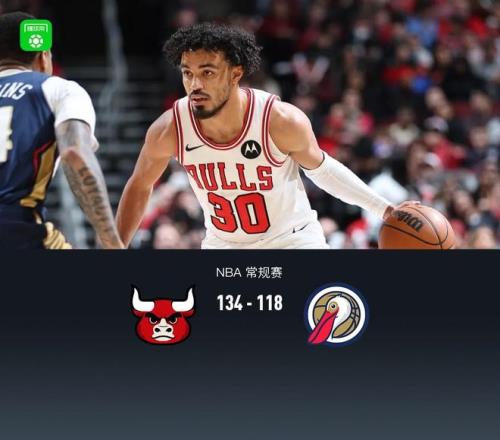 第四节,前半节双方拉锯,维持10分上下分差,节中公牛许尔特、道苏斯接连得分领先17分,鹈鹕一波7-0追至10分,但紧跟公牛又是一波7-0再度拉大分差,鹈鹕再无力反扑,最终公牛134-118战胜鹈鹕。