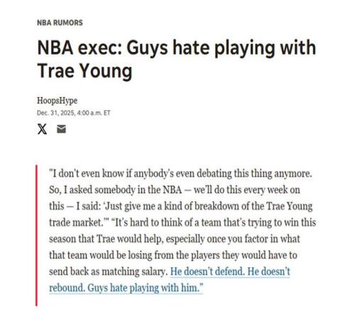 《The Ryen Russillo Show》节目主持人Ryen Russillo也给出类似说法,他公开表示一名高管谈及特雷杨交易可能时直言:“没有争冠级别球队将其视作合理补强对象,尤其是考虑到交易配平问题,他根本不防守,也不拼抢篮板,队友们都不爱和他一起打球。”