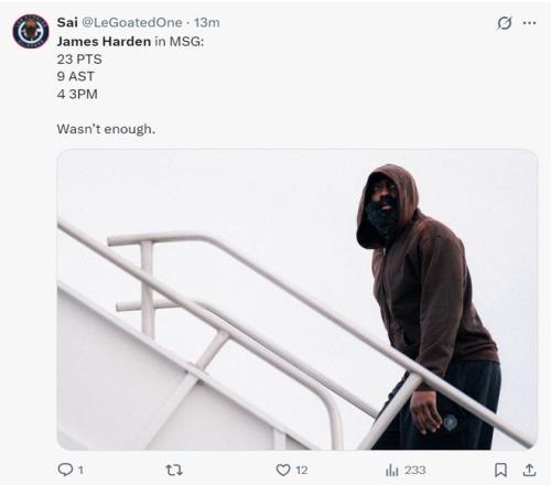 末节,哈登、小卡两个核心一同哑火了,两人合计是7中1,只有哈登命中了一个运动战进球,末节两人合计只有2分,哈登的命中率还更低一些,最终尼克斯完成了大逆转,哈登这场比赛肯定又要背锅了。