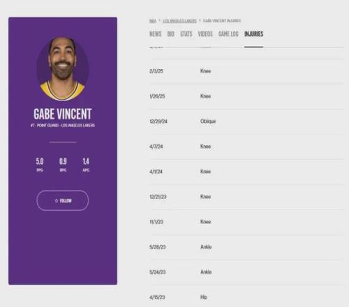 在美国basketball-reference数据网站的DBPM(每百回合防守影响力)方面,文森特以-1.6评分在湖人队内排名倒数第4,仅领先小尼克-史密斯-2.5、八村塁-2.1、克内克特-2,整体防守效率惨不忍睹.