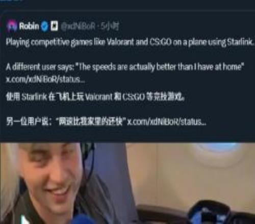 体育资讯1月16日报道宣称 马斯克转载用户在飞机上使用星链体验无畏契约和CS的视频,视频中用户表示除了能够流畅游戏外,网速甚至比家里还快。 对