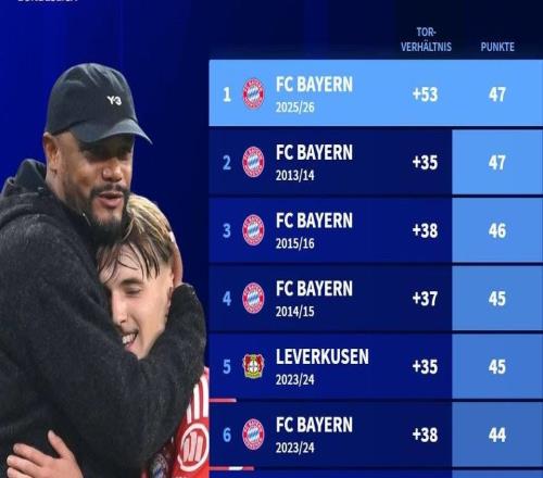 拜仁慕尼黑本赛季创下了德甲历史上半程最佳战绩纪录,德转列出了德甲历史上半场最佳战绩前十,拜仁独占八席,勒沃库森和多特各一席。德甲历史上半程最佳战绩前十1 拜仁 2025-26赛